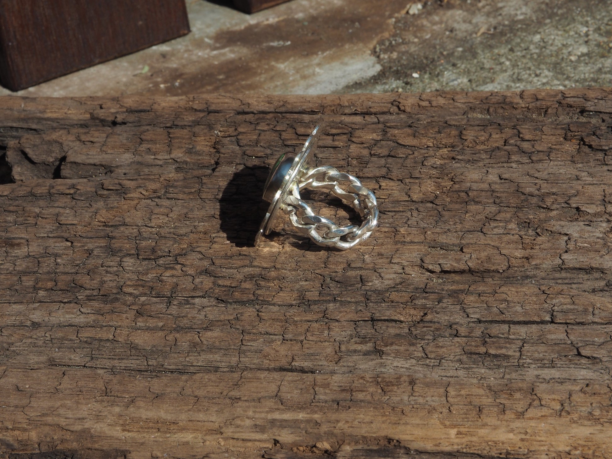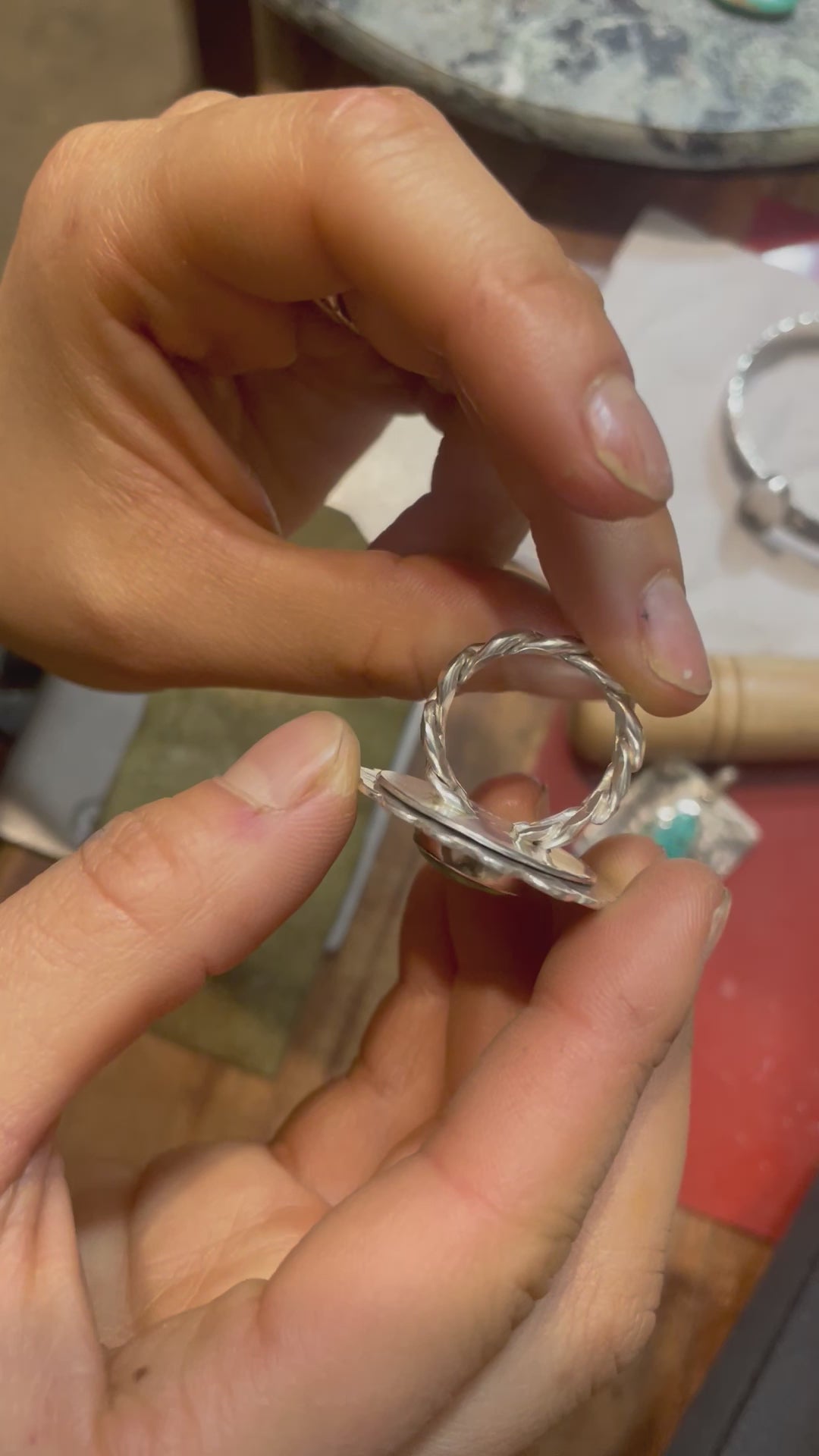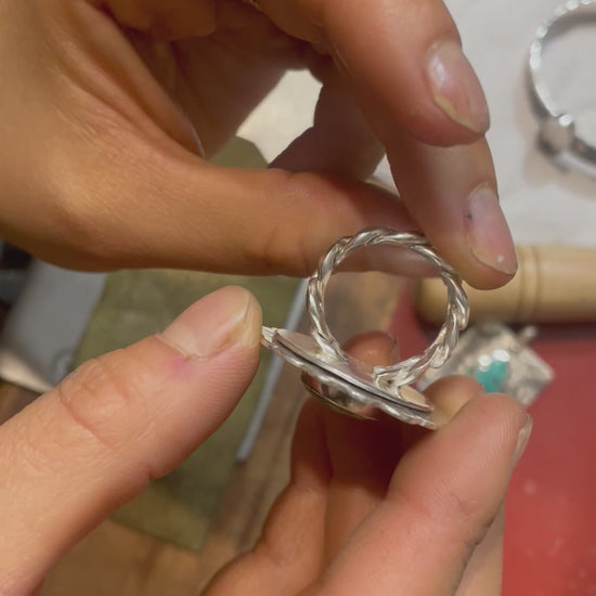 This one-of-a-kind ring features a vibrant Sonoran turquoise stone, beautifully framed by a hand-stamped flower design. The unique chain-link ring band not only adds character but also offers a playful, fidget-friendly movement — perfect for grounding and calming energy throughout the day.